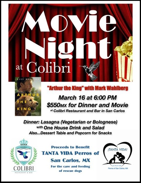- March 16. Movie Night Fundraiser for Tanta Vida Perros. 6:00pm, Colibrí Restaurant & Bar.