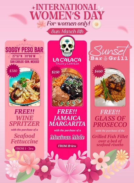 - March 8. International Women’s Day restaurant specials at La Calaca, Soggy Peso & Sunset Bar & Grill. Order one of the meal specials during the times shown on the poster above, and get a free drink.