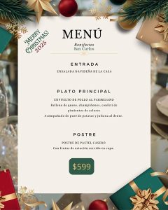 La Cotidiana 1922, December 24Enjoy a special 3-course meal this holiday season at La Cotidiana 1922. Appetizer: Roasted Red Pepper Cream Soup Main Course Options: * Stuffed Chicken Breast – Juicy chicken breast stuffed with smoked ham, cheese, and fresh spinach. Served on buttered fettuccine covered with a creamy mushroom sauce, OR * Port Wine Steak – Tenderloin steak served with creamy mashed potatoes, drizzled with rich port wine sauce, topped with asparagus and a crispy beet fry. Dessert: Red Berries Panna Cotta Also enjoy a complimentary Welcome Cocktail – Cranberry Martini with a hint of raspberry flavor. The cost for the Chicken option is 550 pesos and the cost for the Steak option is 680 pesos. There will be live piano music by Doug, playing holiday favorites. Please make your reservations by calling 622-227-0002 ext. 3 or WhatsApp 631-111-0734. |
