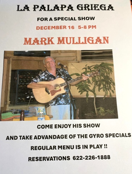 - November 5. Mark Mulligan One Night Only Show with Jimmy Stadler. 5:00pm, La Palapa Griega.