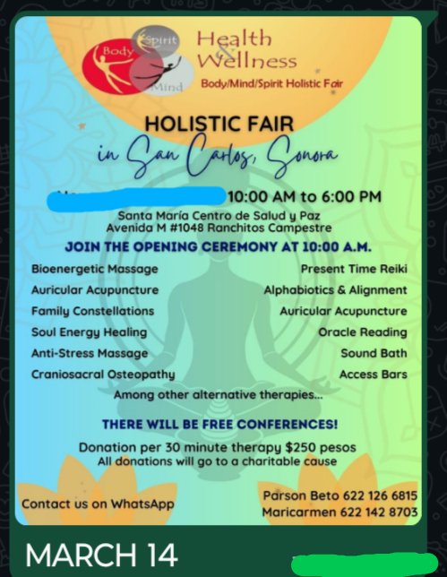 - March 14. Holistic Health Fair. 10:00am – 6:00pm, Santa Maria Centro de Salud y Paz.