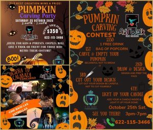 Ideal for adults and children. For kids who come in costume, they will get some treats. The event is from 3:00pm – 7:00pm. The cost is 350 pesos and includes: * the pumpkin The best creation wins a prize. We’ll finish the afternoon with a movie under the stars. Reserve your place now at 622-115-3466. Don’t miss out on this family-friendly event. |