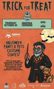Bring your dressed-up furry friends, have dinner and drinks, and enjoy a night of live music by Elvino who will play a mix of electroacoustic, folk, rock, and blues from 6:00pm – 9:00pm. 15% of cash sales goes directly to the SBPA (cash sales only). The MC for the evening will be the one and only Tammi Miller. There will also be a 50/50 Raffle for SBPA to support our sterilization clinics. It’s from 6:00pm – 9:00pm (come early and stay late). The Halloween pet contest will be at 8:00pm. Dress your furry loved one up in his or her favorite Halloween costume and have a wickedly good time together at Marvida’s. There’ll be Prizes for the top 3 costume winners provided by local business collaborators. Be ready for some ruff competition. Don’t miss out on this fun Halloween event. |