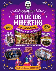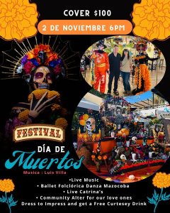 The Day of the Dead reminds us that love is eternal, and though death has separated us, the bond of affection remains stronger than ever. And With flowers and candles, we light the memory of those who have departed, knowing that their souls still watch over us and that love knows no boundaries or end. So today we celebrate the lives of those who have left, but left indelible imprints on our hearts. Their teachings and laughter are still alive in us. We’ll have a community altar on display and we welcome you to bring a picture any loved one to place in our Altar. Enjoy live music by Luis Villa, colorful Catrins and Catrinas with whom you can take pictures, and dances performed by Ballet Folklórica Danza Mazocoba. The event starts at 6:00pm and their is a 100 pesos cover charge. Come in your Catrina dress and receive a complimentary drink. For your reservations, please call 622-115-3466. |