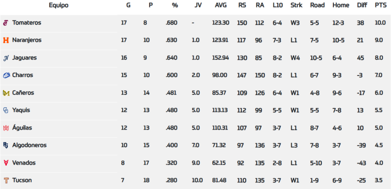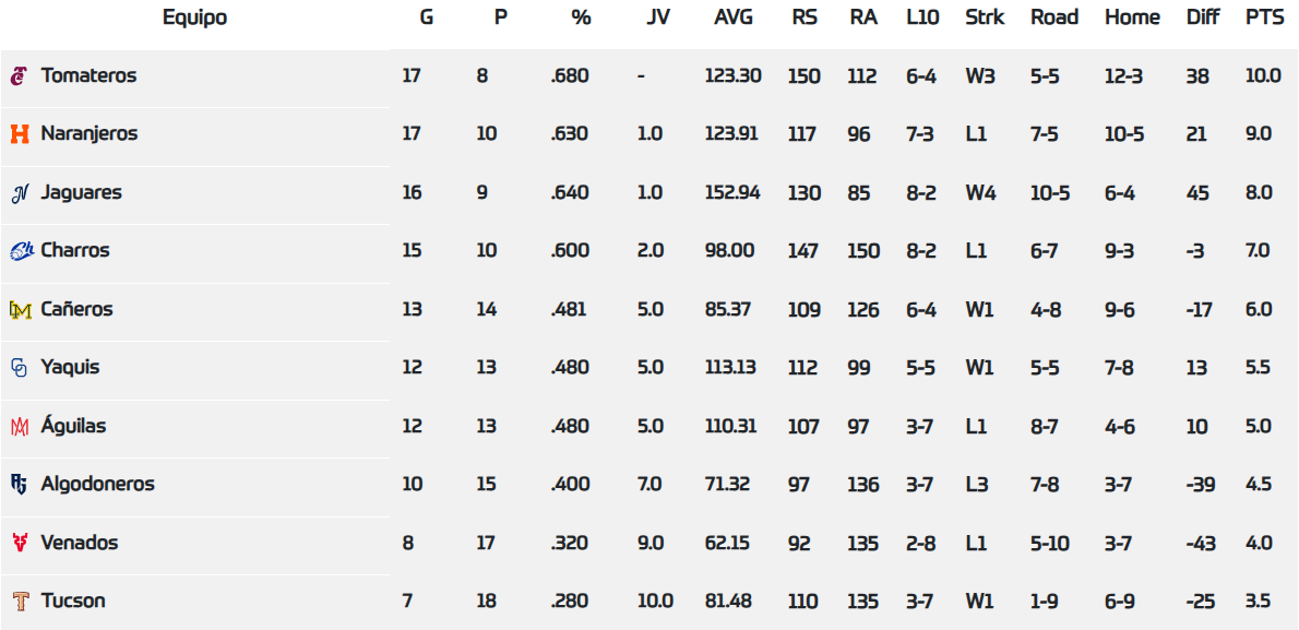 The Naranjeros were the 2009, 2013 and 2024 League Champions, and are the most successful team in the league with 17 titles. In 2009, 2013 and 2024 they represented Mexico in the Serie del Caribe — winning it in 2013.