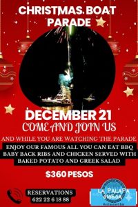The cost is 800 pesos and it includes: * 3+ hour boat tour along the shoreline of Posada and San Francisco beaches where you’ll be cheered on by all the parade-watchers along the beach. The boat leaves at approx. 5:30pm from Dock M at Marina San Carlos. You need to be at the dock at 5:00pm. To book your spot, please WhatsApp +52 622-169-4231 or come into the office between HammerHead’s restaurant and the Marina Office. We have spaces available on Oasis and Oasis II and the Dhow, so bring your family and friends. This will be an unforgettable evening so don’t miss out! The same boats will also be participating in the 2nd Lighted Boat Parade on Saturday, December 27 and you can reserve your place for that event now too. |