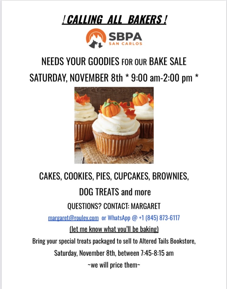 SBPA needs your baked goods for the fundraiser. Anyone who can bake cakes, cookies, pies, cupcakes, brownies, dog treats or your own special creation, please WhatsApp Margaret at 1-845-873-6117 or email margaret@rouley.com.