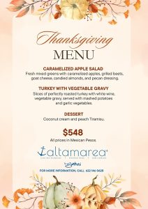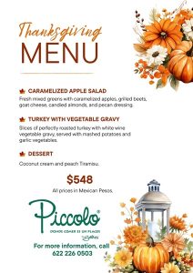 Savor the tastes of a delicious 3-course meal. * Caramelized Apple Salad – Fresh mixed greens with caramelized apples, grilled beets, goat cheese, candied almonds, and pecan dressing. * Turkey with vegetable gravy – Slices of perfectly roasted turkey with white wine, vegetable gravy, served with mashed potatoes and garlic vegetables. * Dessert – Coconut cream and peach Tiramisu. The cost is 548 pesos per person. For your reservations, call 622-226-0503. |