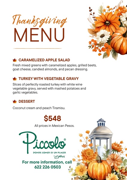Join us at Colibrí Restaurant & Bar for our Thanksgiving Dinner.For 550 pesos, dine on our special meal of: