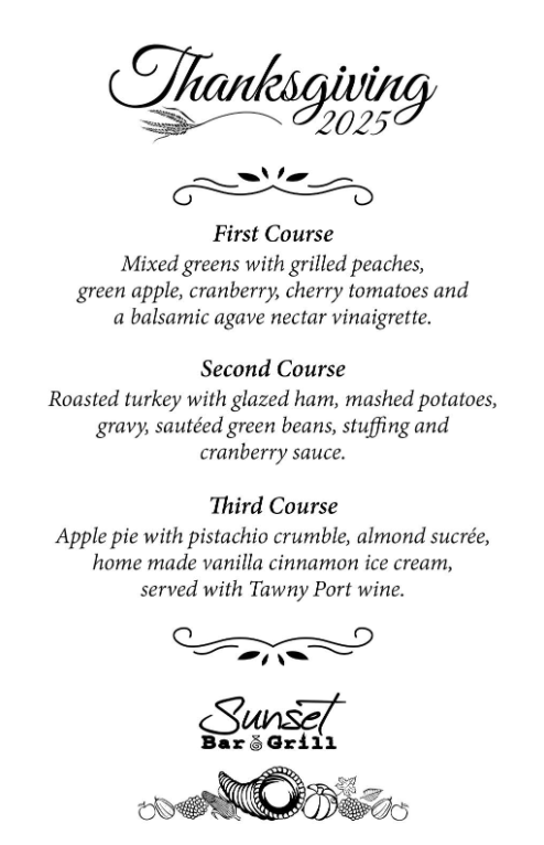 Join us on the beach at Sunsets for a for a warm and cozy Thanksgiving meal!