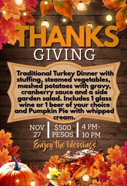 Starting at 4:00pm, we’ll be serving a Traditional Turkey dinner with stuffing, steamed vegetables, mashed potatoes and gravy, cranberry sauce and a side garden salad for 450 pesos.